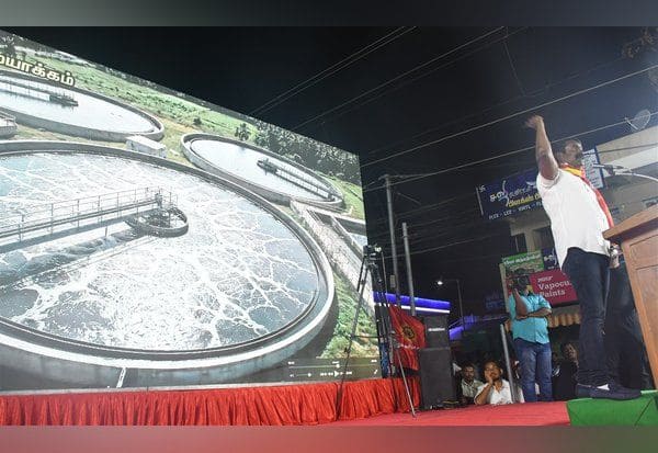 'அங்க பாருடா... அமெரிக்காகாரன் எப்படி தொழில் பண்றான்; நல்லா பாருடா... பிரேசில்காரன் என்ன மாதிரி விவசாயம் பண்றான்... ெஹலிகாப்டர்ல போய் ஆடு, மாடு மேய்க்குறான் பாருடா... பூமியைத் தாய் தாய்ன்னு சொல்லிட்டு அது மேல பாலிதீன் குப்பையை வீசியெறியற... கழிவுநீரை திறந்துவிடற ... இந்த பூமி, காத்து, தண்ணீ எல்லாத்தையும் நாசமாக்கிட்டியேடா....? எனக்கொரு வாய்ப்பு கொடுத்து பாரு. சுத்தமான காற்று, தண்ணியை தர்றேன்... எல்லாத்துக்கும் அரசு வேல தர்றேன்; இலவசம் கொடுத்தது கையேந்த வைக்கமாட்டேன்...'' இப்படி தான் பிரசாரம் செய்கிறார் நாம் தமிழர் கட்சி தலைமை ஒருங்கிணைப்பாளர் சீமான். மேடையில் பொருத்தப்பட்டுள்ள டிஜிட்டல் திரையில், 'சிப்காட்' தொழிற்பேட்டை உள்ளிட்ட பல இடங்களில் தொழிற்சாலைகளில் இருந்து வெளியேறும் கழிவுகளால் ஏற்படும் பாதிப்புகள் தொடர்பான ஒளிப்படம் காட்டப்படுகிறது.