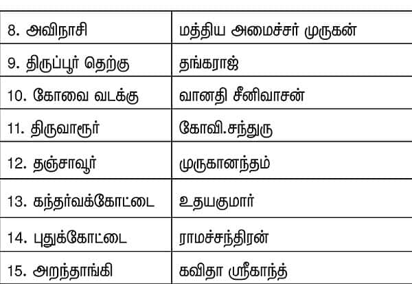 பா.ஜ. தேசிய பொதுச்செயலர் அருண்சிங் நேற்று மதியம் பட்டியலை வெளியிட்டார். அதில் மத்திய அமைச்சர் முருகன், எம்.எல்.ஏ.க்கள் நயினார் நாகேந்திரன், வானதி சீனிவாசன், காந்தி ஆகியோருக்கு வாய்ப்பு தரப்பட்டுள்ளது. மொடக்குறிச்சி எம்.எல்.ஏ. சரஸ்வதியின் மருமகள் கிருத்திகாவுக்கு சீட் தந்துள்ளனர்.